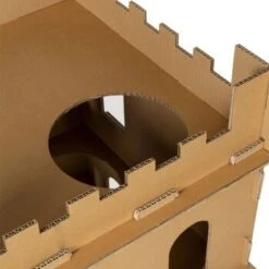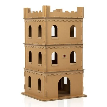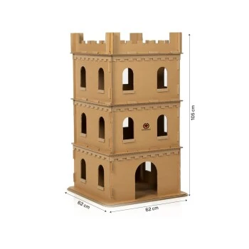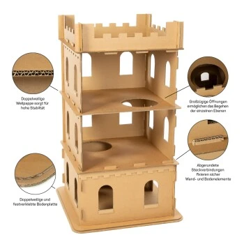 Die stattliche Größe von 62 x 62 x 105 cm erlaubt gleich mehreren Katzen zugleich Spielspaß in und um die große Festung. Die Burgmauern mit ihren starken Wänden halten jedem Ansturm und jeder Besatzung stand. Für die Bodenplatte werden zwei Lagen doppelwellige und festverklebte Wellpappe verwendet und garantieren sicheren Stand.