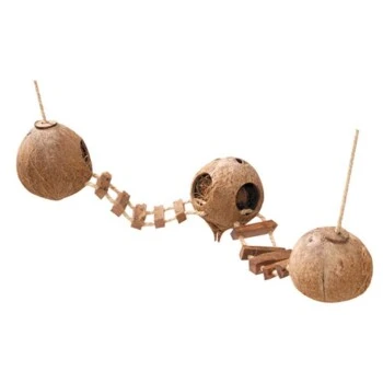Die drei ausgehöhlte KokosnĂŒsse mit grossen Ăffnungen sorgen fĂŒr viel Abwechslung und BeschĂ€sftigung. Mit den zwei Befestigungsseilen und den Karabinerhaken kann es leicht im Kleintierheim befestigt werden. Die einzelnen HĂ€user sind mit einer Holzleiter verbunden.