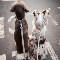 DIe FĂĽhrleine ist 2 Meter lang, 25mm breit und 3-fach verstellbar. Die Ringe und Karabiner sind glanzverchromt.